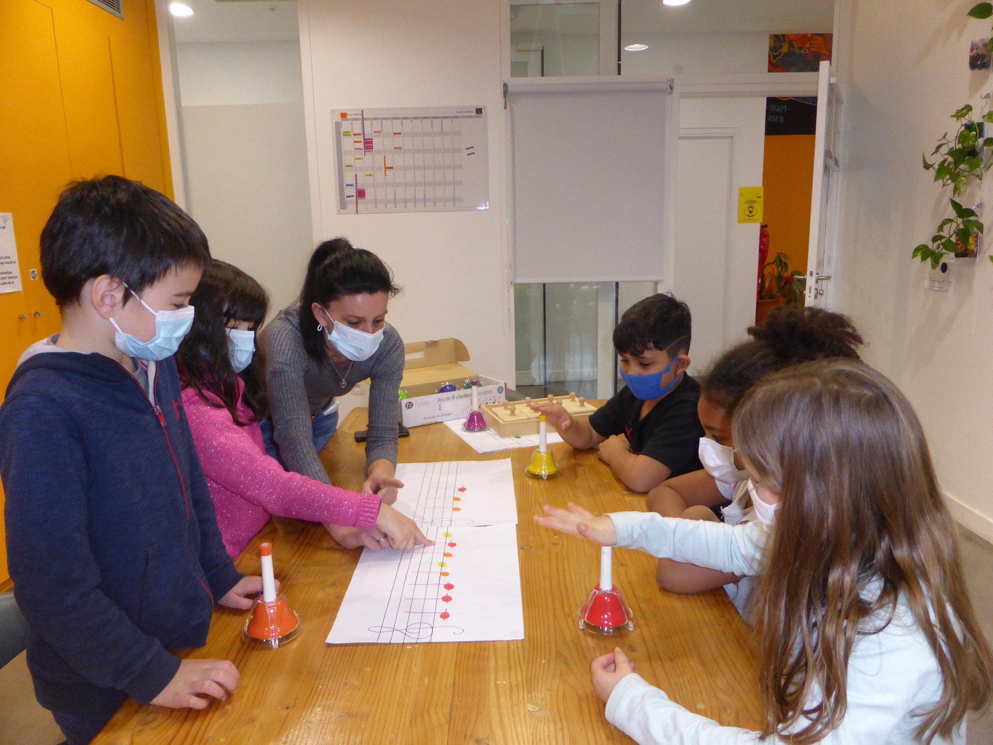 Pour l'ouïe : un jeu avec des cloches de couleur pour jouer et reconnaître une mélodie