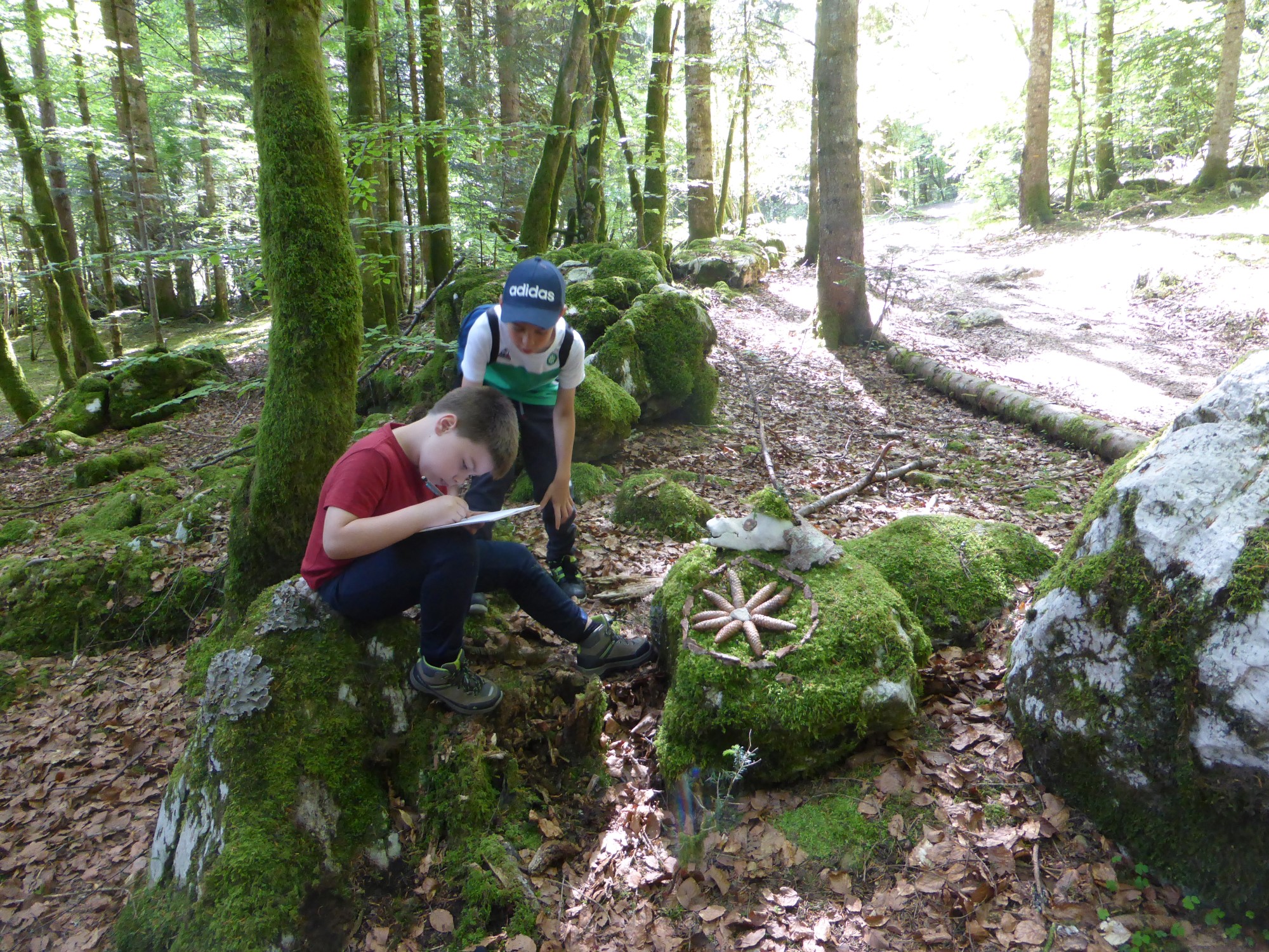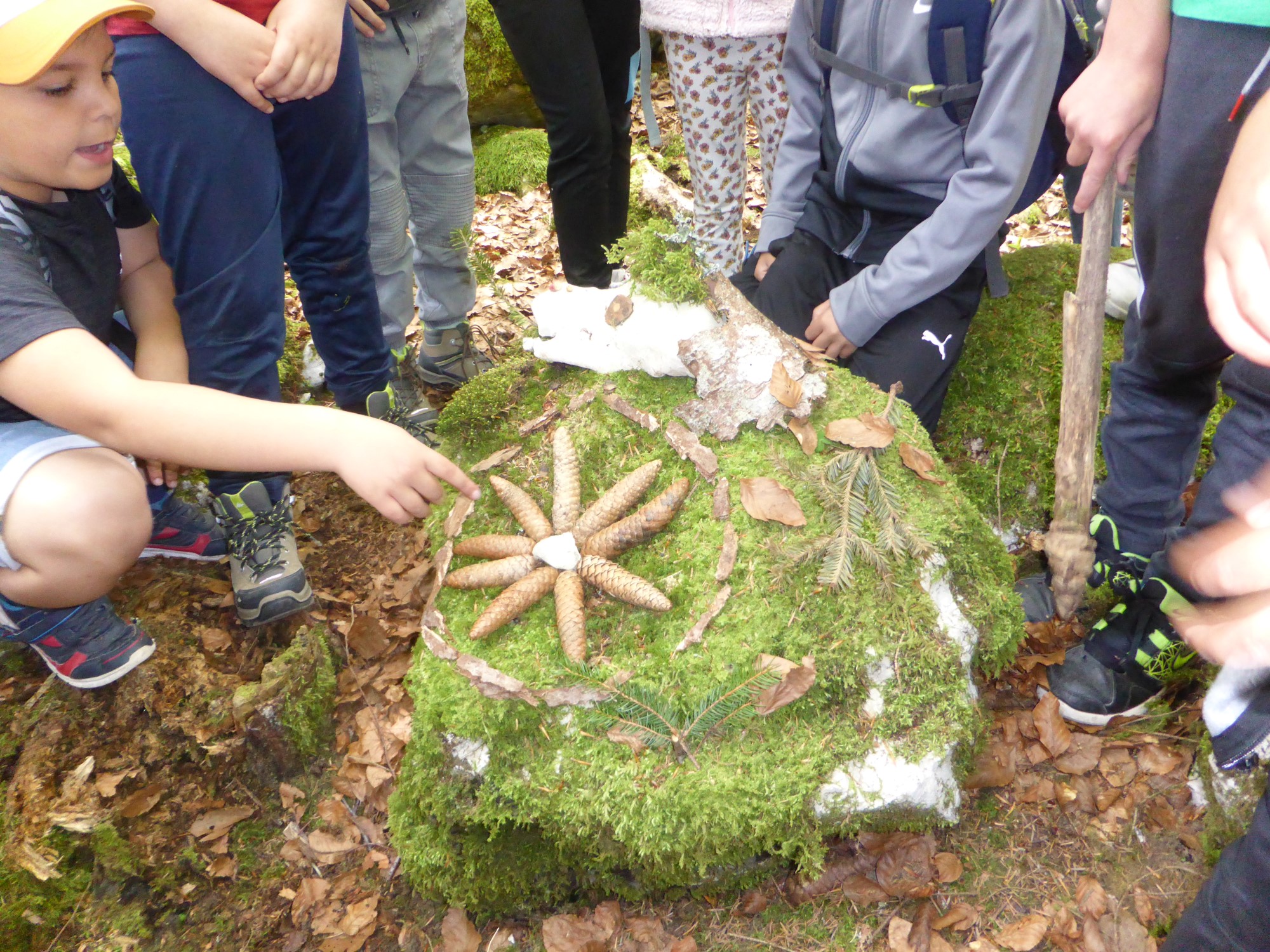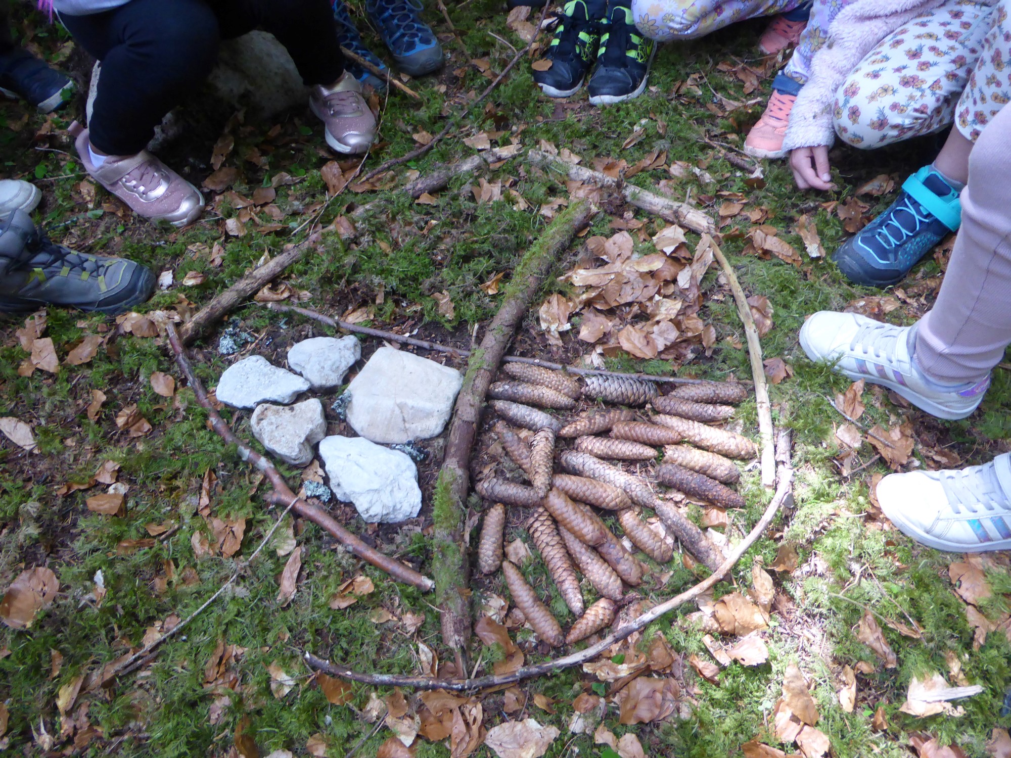 Nous avons également fait la connaissance de Sandrine qui s'est occupée de nous en arrivant. Elle nous a emmenés dans la forêt et nous avons observé des oeuvres de land art. Le land art, c'est faire des oeuvres d'art à partir d'éléments naturels. Ces oeuvres sont éphémères. Elles sont détruites par la pluie, le vent ou les animaux.
