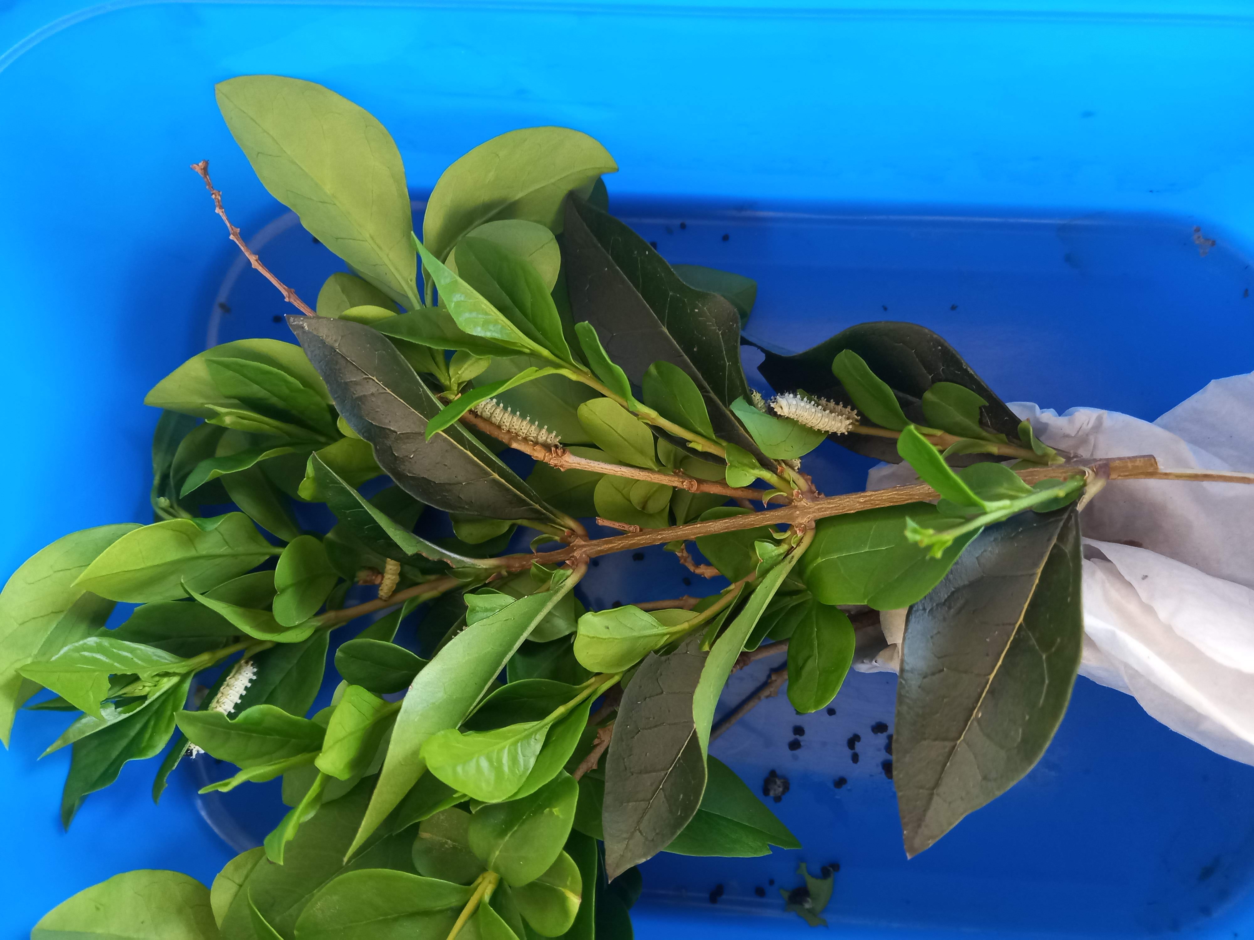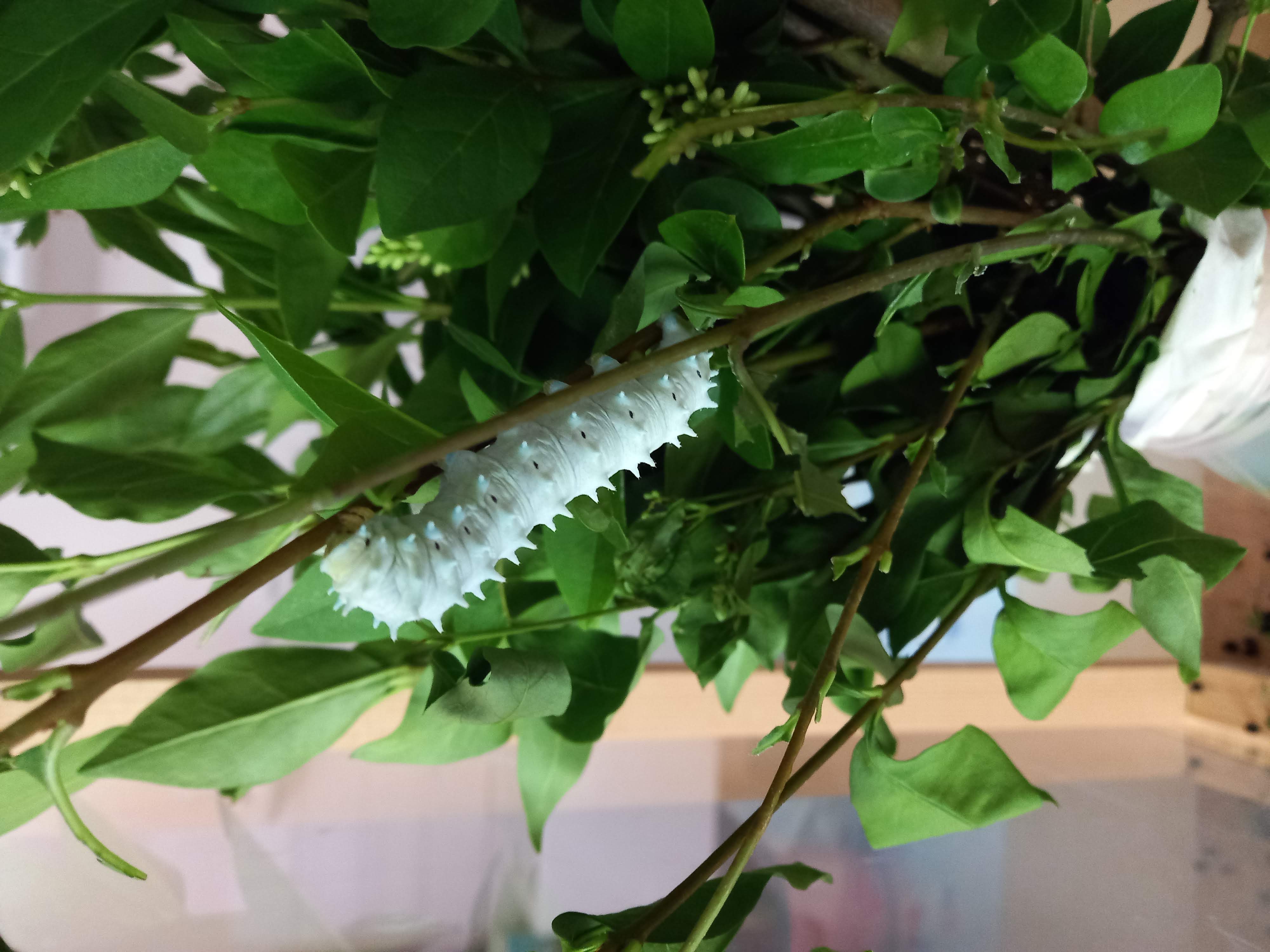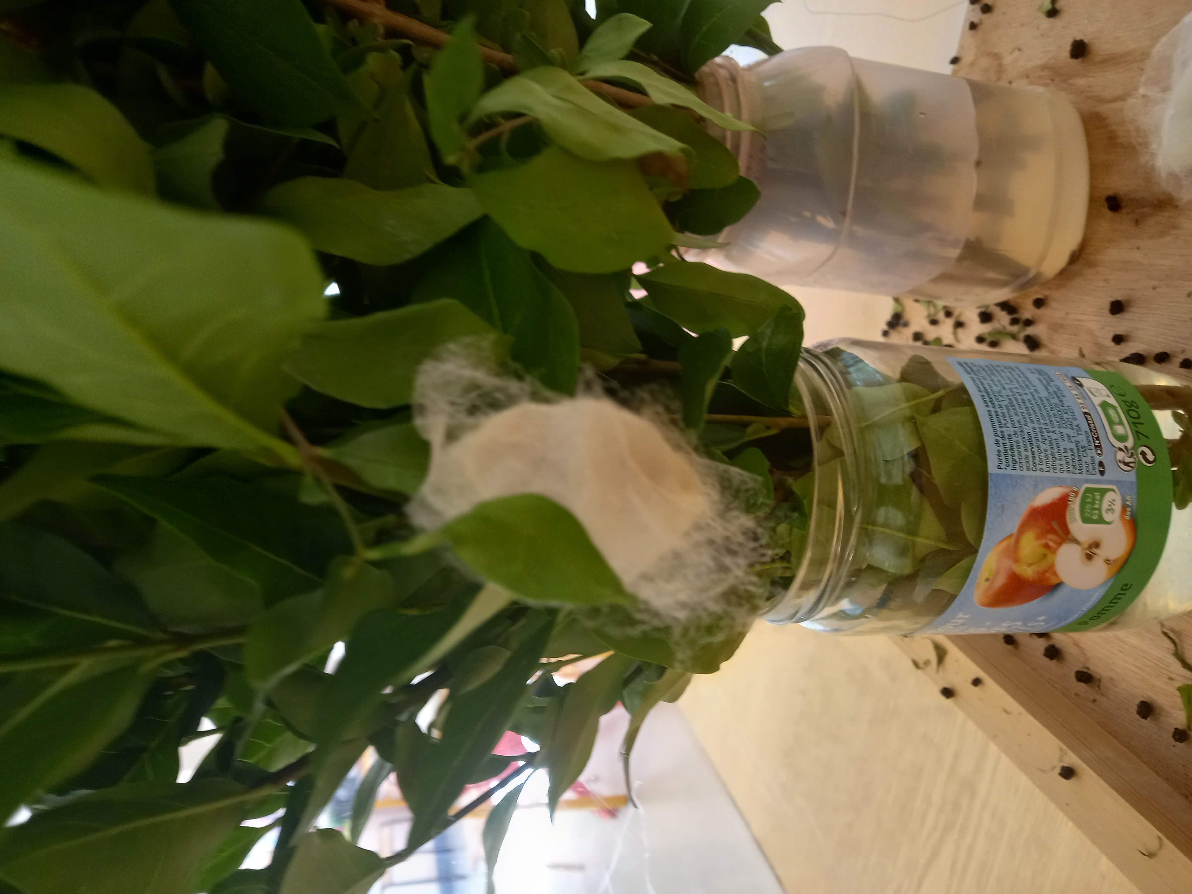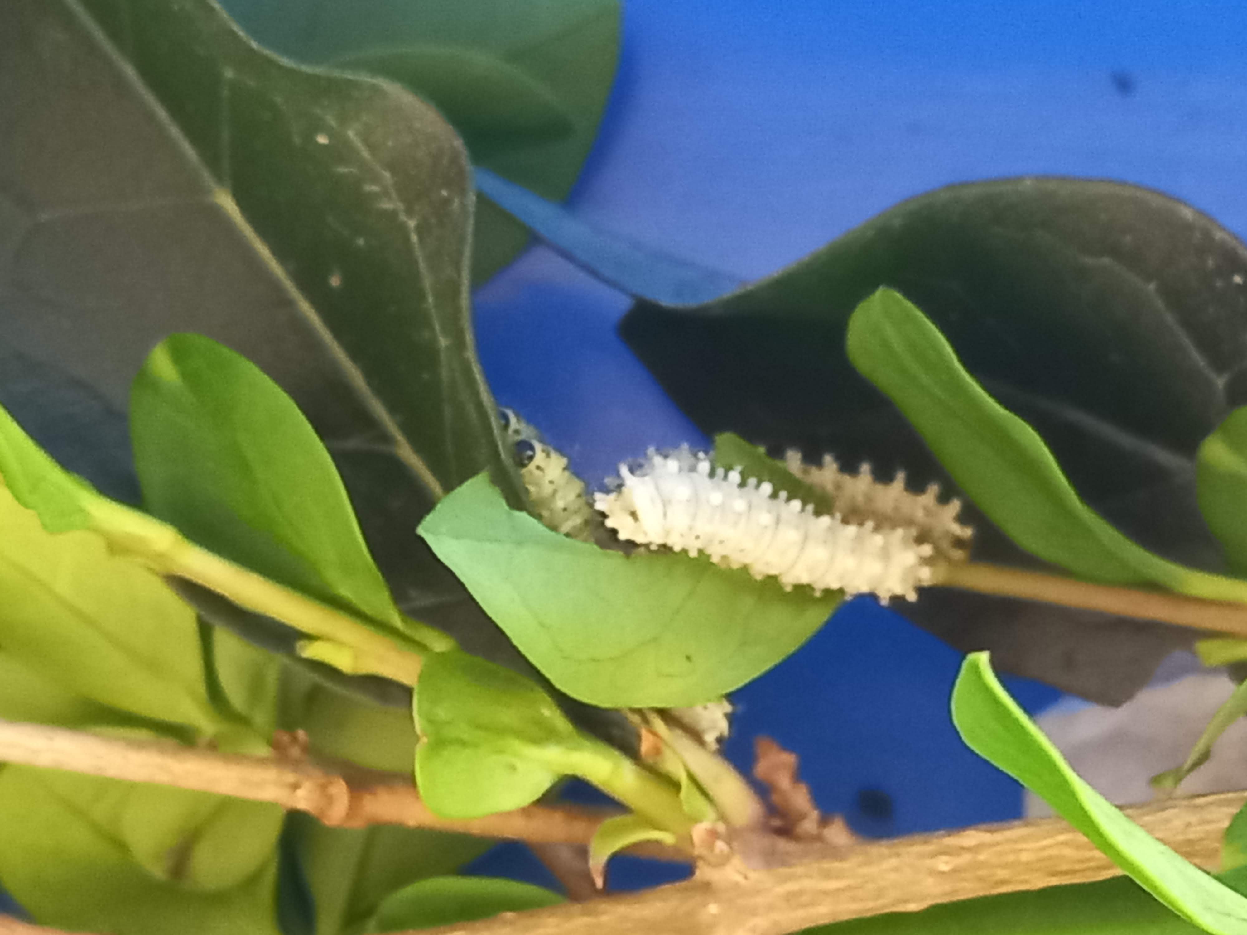 Nous avons d'abord observé de toutes petites "billes". Nous nous sommes rendus compte que c'était des oeufs! De toutes petites chenilles sont sorties. Elles étaient d'abord vertes et jaunes. Puis elles ont beaucoup mangé et elles sont devenues grosses et blanches. Il faut bien penser à leur mettre de nouvelles branches avec des feuilles fraîches!