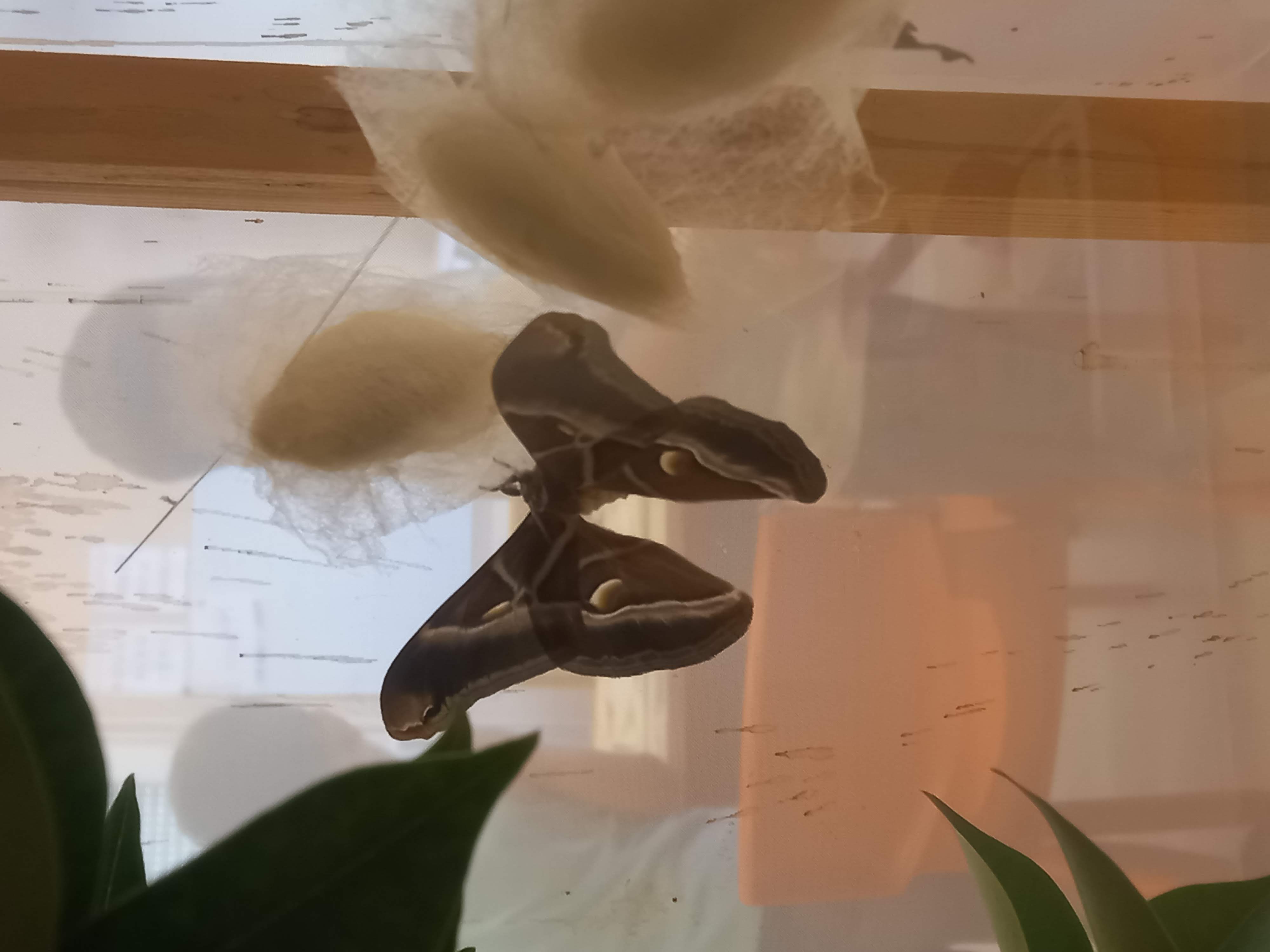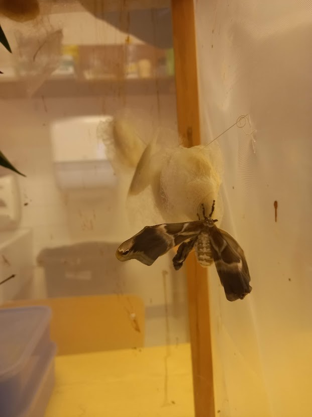Les chenilles se sont ensuite entourées de fil blanc. Elles ont fait des cocons. De magnifiques papillons de nuit sont sortis chacun leur tour!