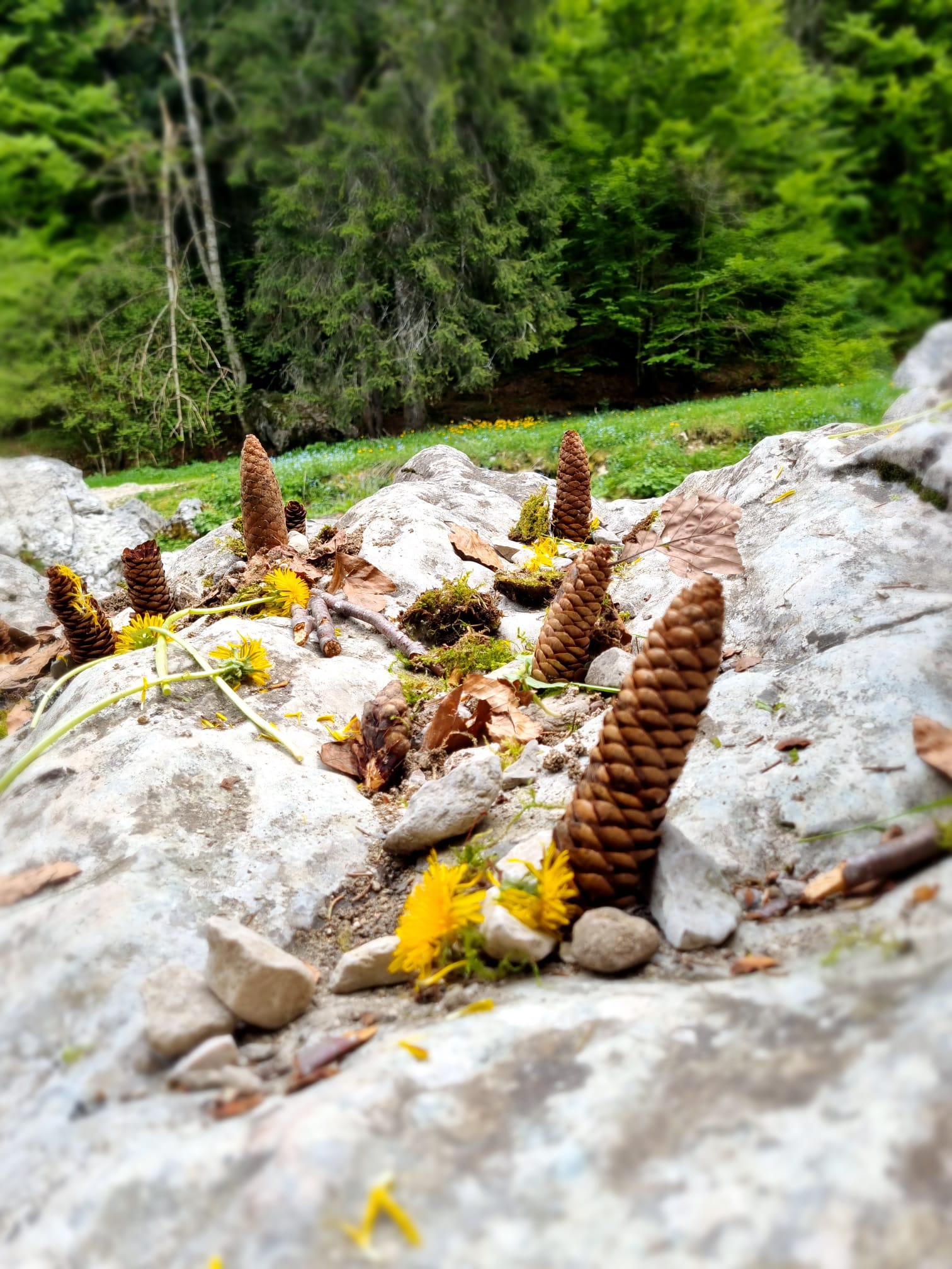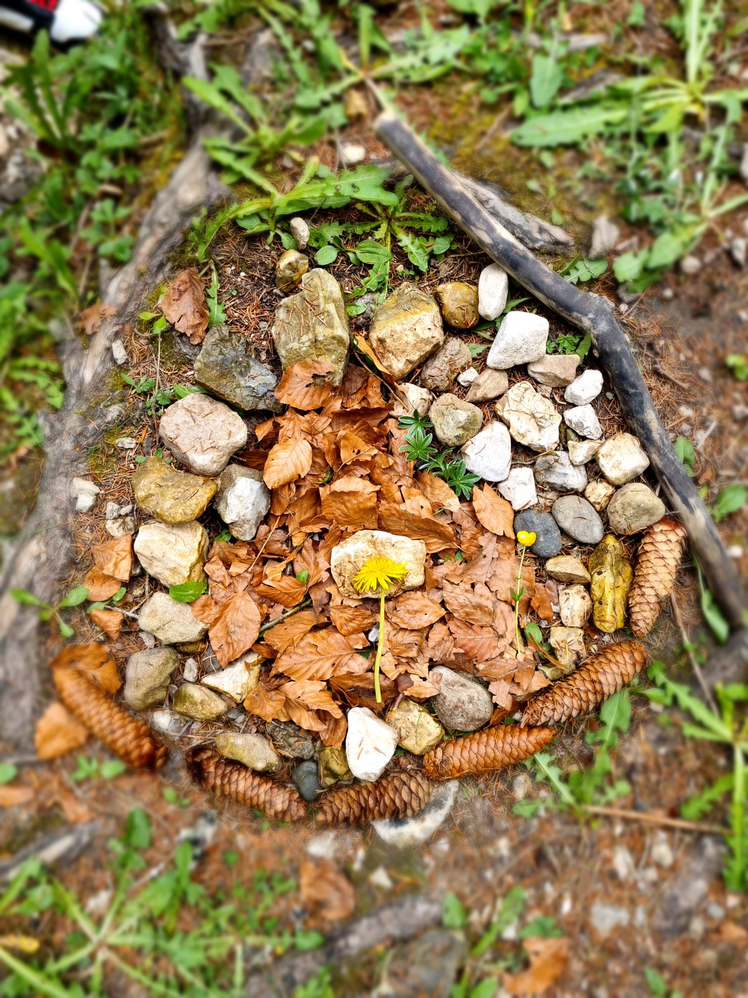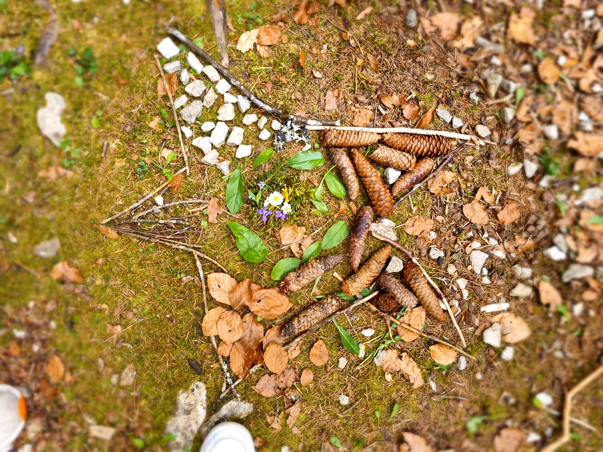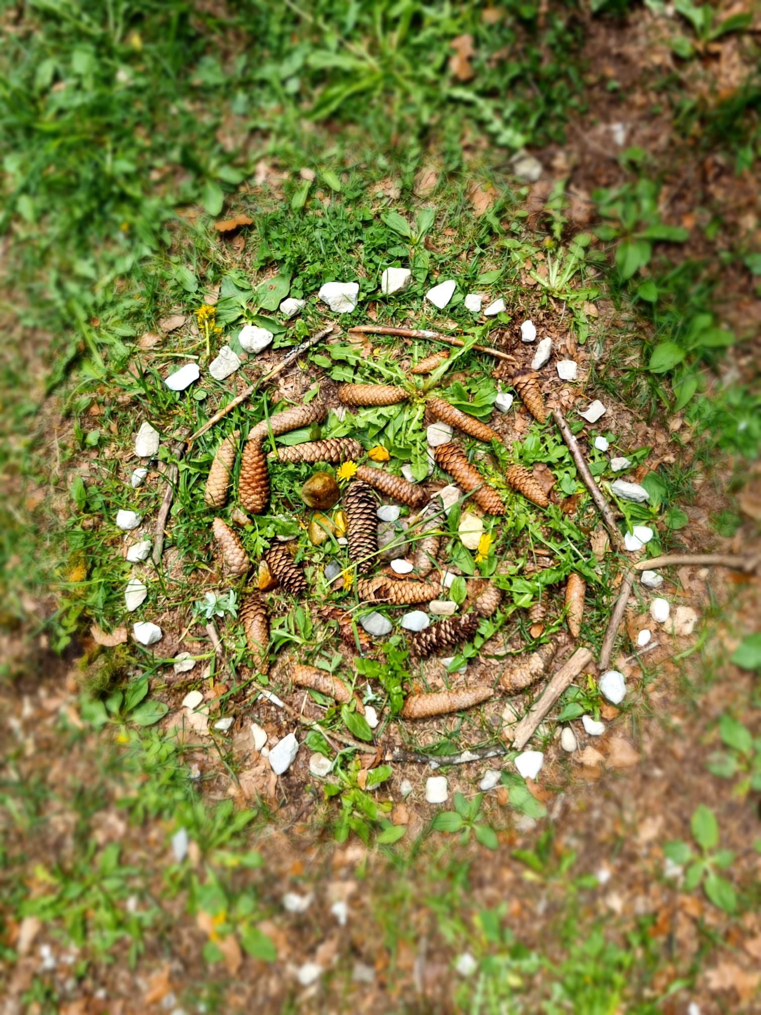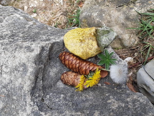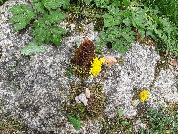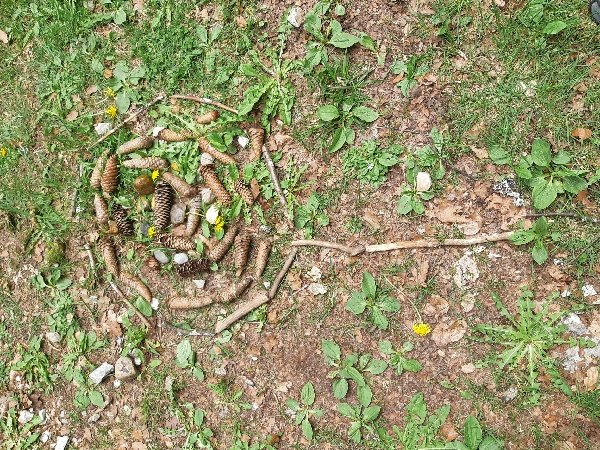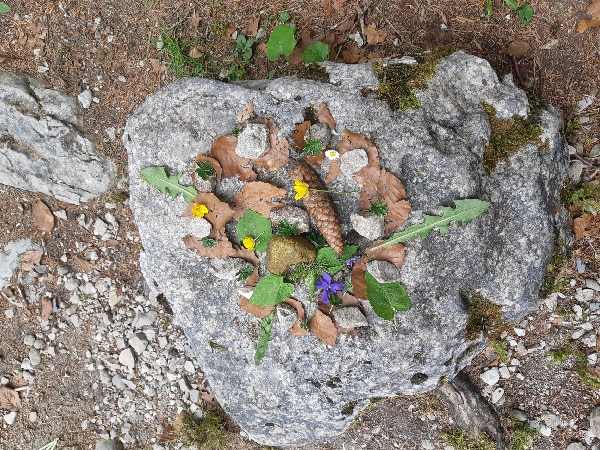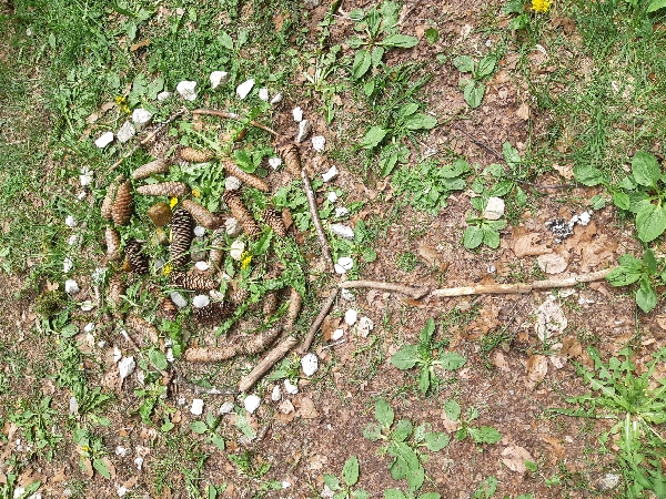 L'après-midi nous avons fait du land art dans la nature. On a utilisé du sable, des branches, des pommes d'épicéa, des pierres, des fleurs et des feuilles.